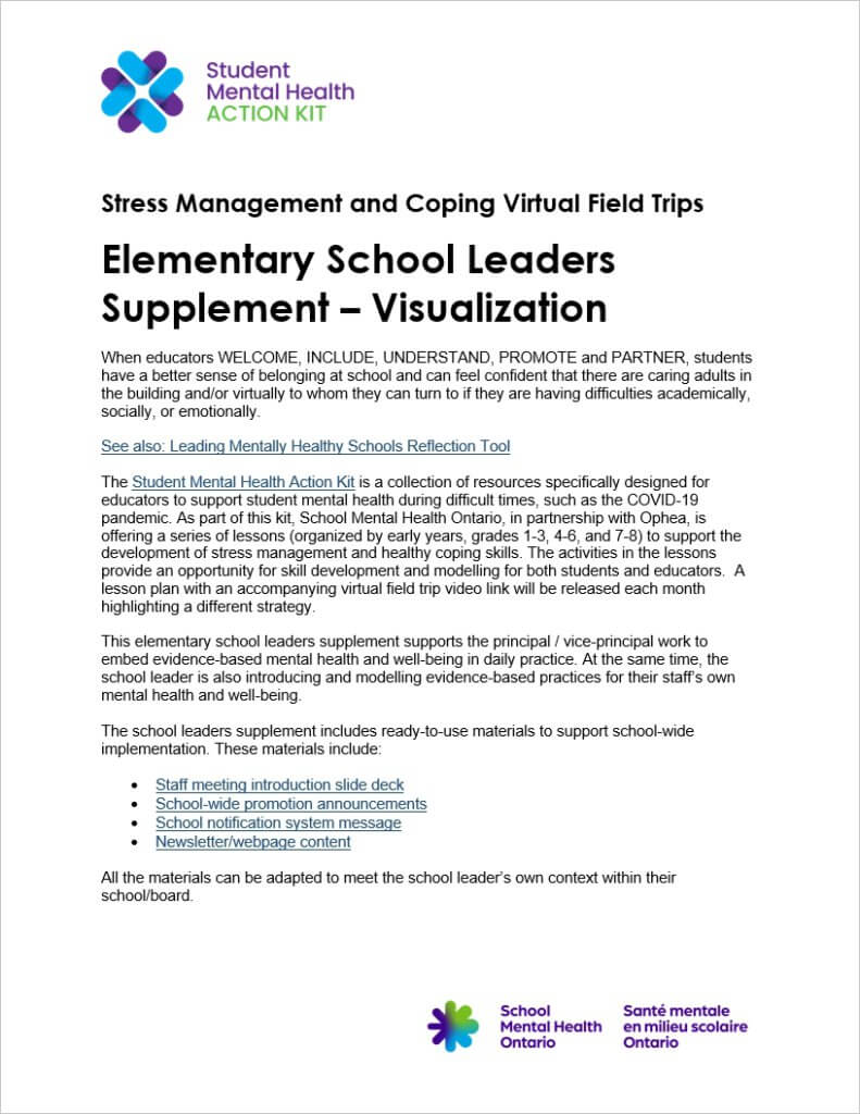The virtual field trips are a series of six lessons per division that support students’ development of stress management and coping skills. Each lesson includes a minds-on activity, a pre-recorded virtual field trip session and a consolidation activity.