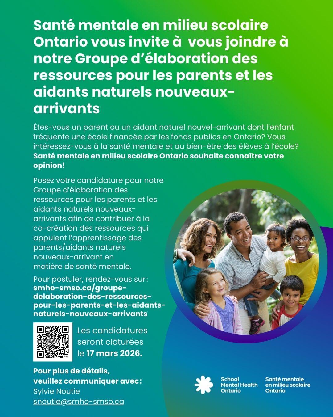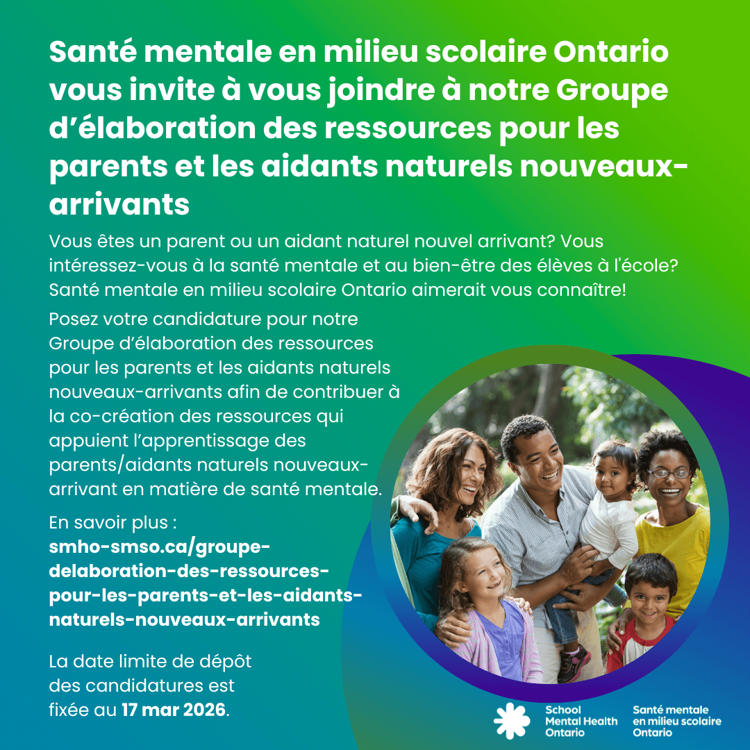 Santé mentale en milieu scolaire Ontario vous invite à vous joindre à notre Groupe d’élaboration des ressources pour les parents et les aidants naturels nouveaux-arrivants