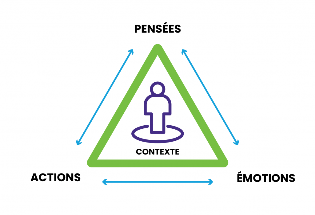Un schéma d’un triangle avec l’étiquette « Pensées » à la pointe du haut, « Actions » au coin inférieur gauche et « Émotions » au coin inférieur droit. Des flèches bidirectionnelles relient les trois mots. À l’intérieur du triangle se trouve une icône représentant une personne debout, accompagnée du mot « Contexte ».