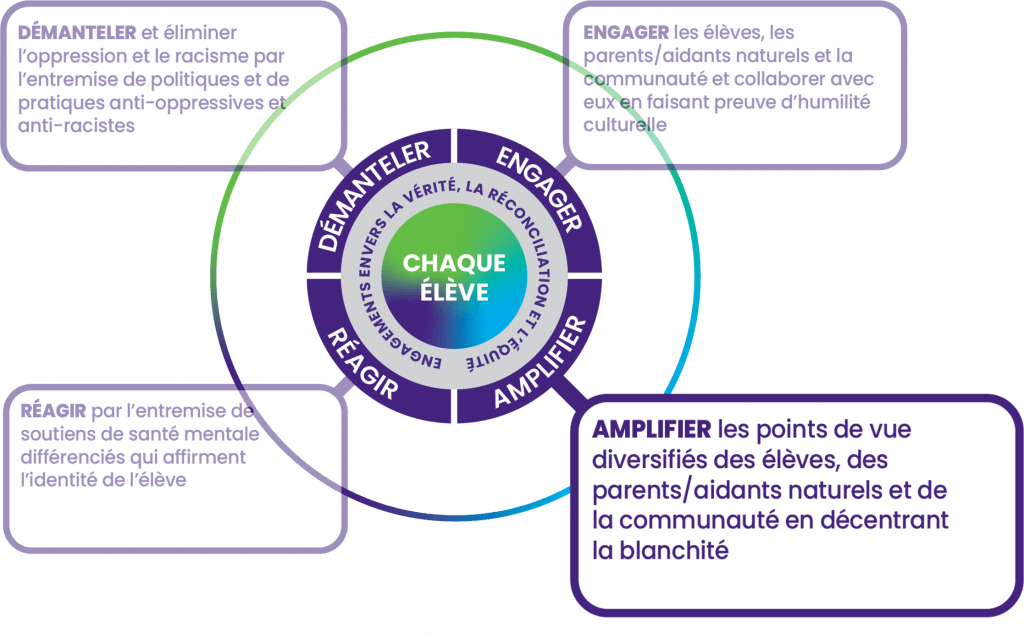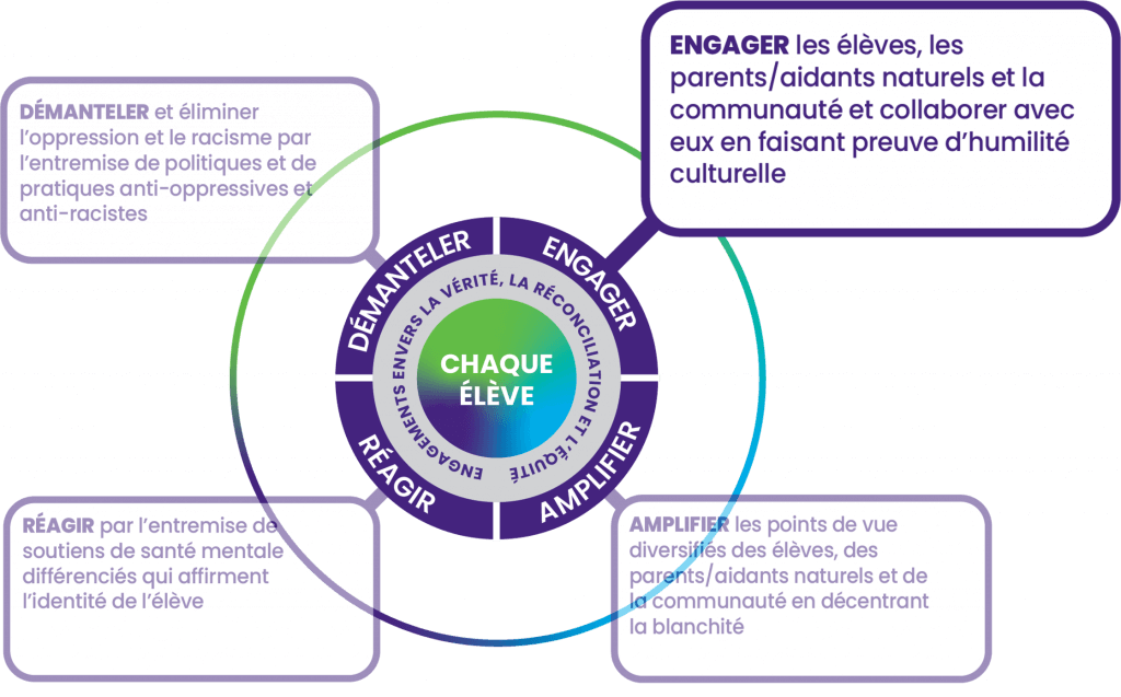 • engageons les élèves, le personnel, les parents et les aidants naturels, ainsi que les partenaires communautaires, dans les efforts pour réduire la stigmatisation et pour promouvoir la santé mentale fondée sur l’affirmation identitaire;