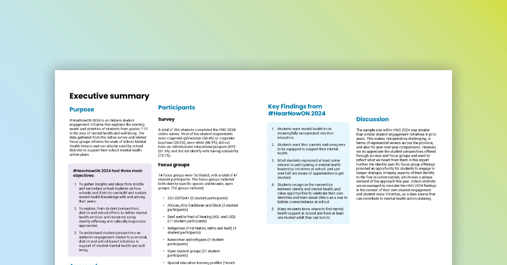 School Mental Health Ontario partnered with the Centre for School Mental Health at Western University on #HearNowON 2024 to gather input from middle and secondary school students across Ontario on their learning needs and priorities related to mental health and well-being.