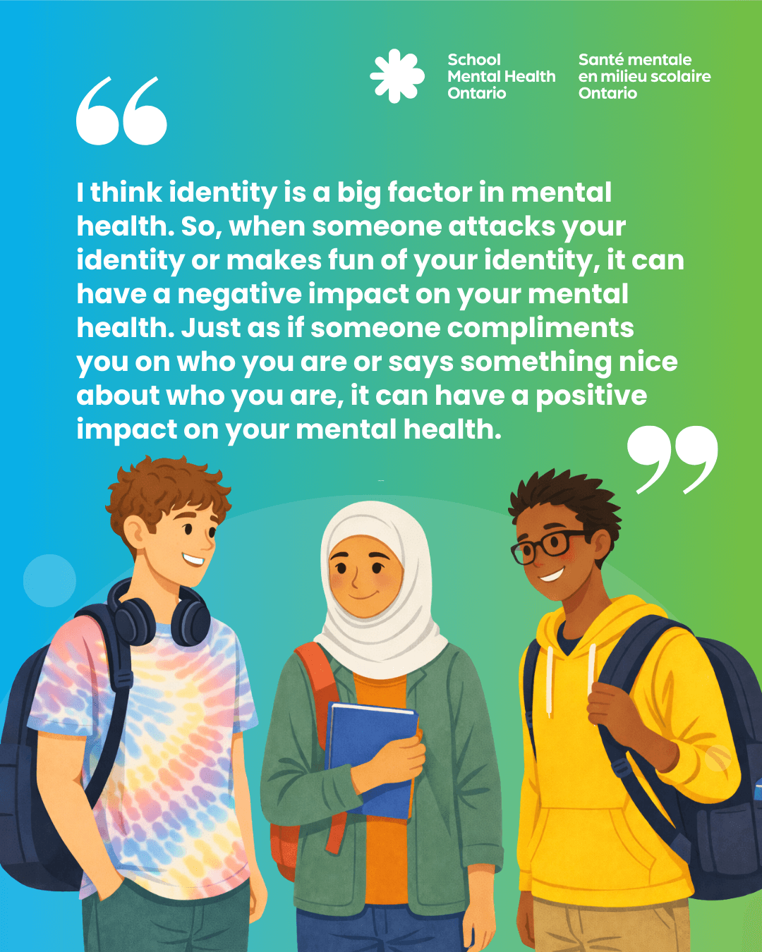 I think identity is a big factor in mental health. So, when someone attacks your identity or makes fun of your identity, it can have a negative impact on your mental health. Just as if someone compliments you on who you are or says something nice about who you are, it can have a positive impact on your mental health.