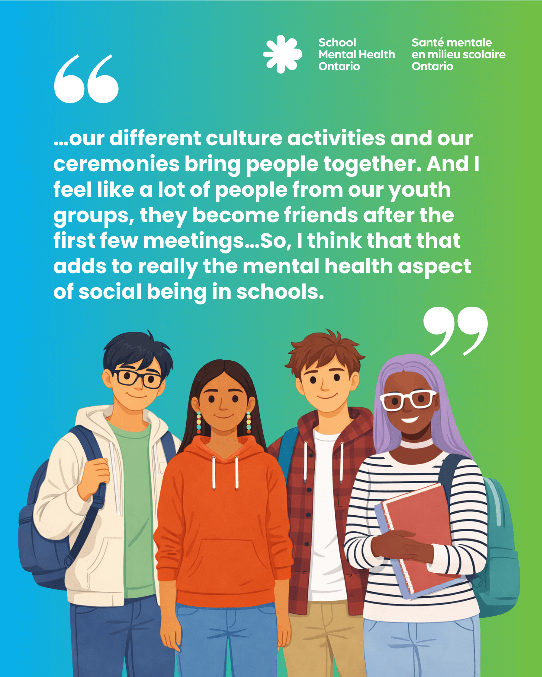 “…our different culture activities and our ceremonies bring people together. And I feel like a lot of people from our youth groups, they become friends after the first few meetings…So, I think that that adds to really the mental health aspect of social being in schools.”