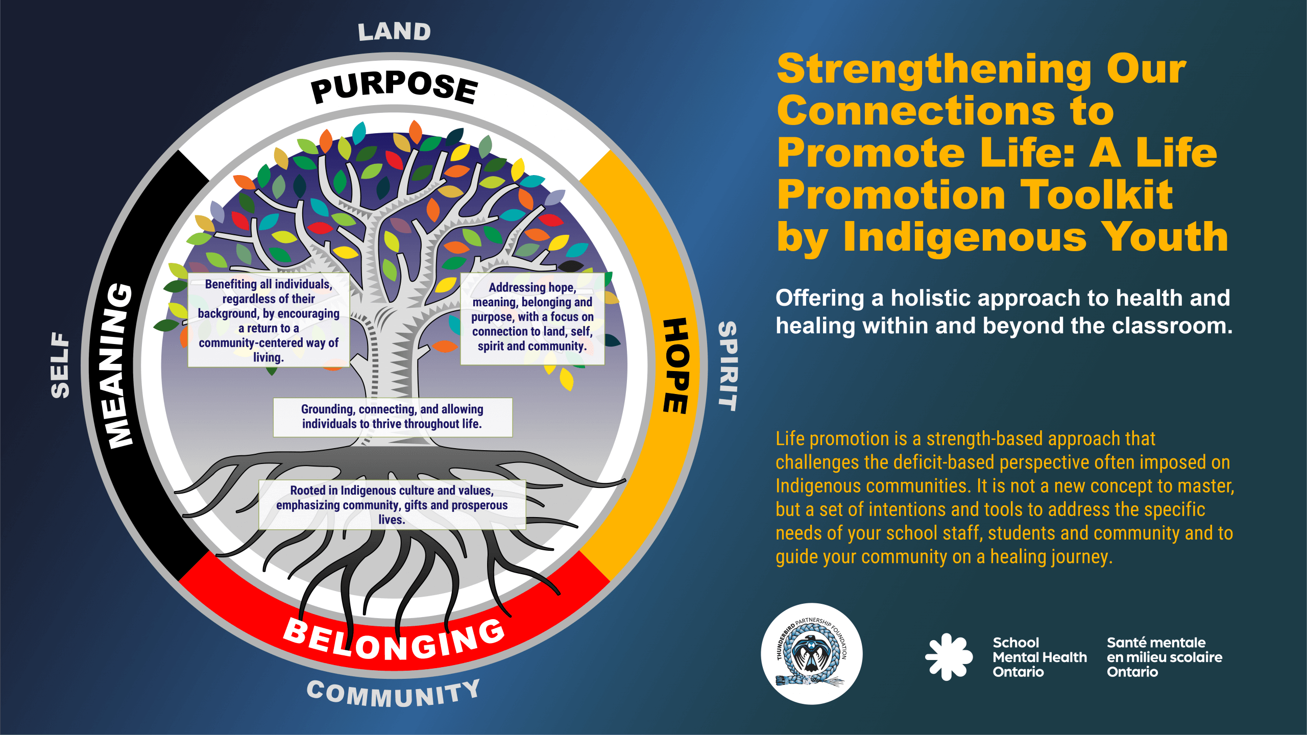 Infographic on a dark blue background. Title is “Strengthening Our Connections to Promote Life: A Life Promotion Toolkit by Indigenous Youth.” Text: Offering a holistic approach to health and healing within and beyond the classroom. Life promotion is a strength-based approach that challenges the deficit-based perspective often imposed on Indigenous communities. It is not a new concept to master, but a set of intentions and tools to address the specific needs of your school staff, students, and community and guide your community on a healing journey.“