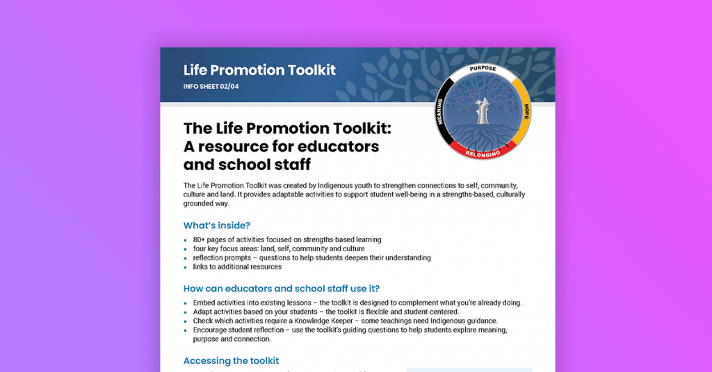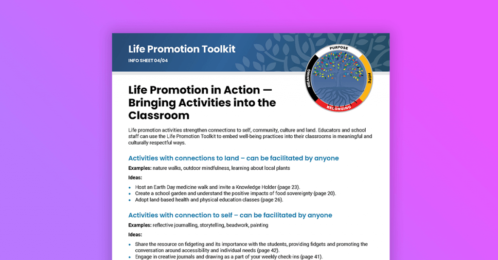 Life promotion is more than suicide prevention—it’s a strengths-based holistic approach to well-being. Rooted in Indigenous ways of seeing, being, knowing, and doing, life promotion fosters connection to self, community, culture, and land. This resource introduces the foundation of life promotion and how it can be embedded into school communities to nurture belonging, meaning, purpose, and hope.