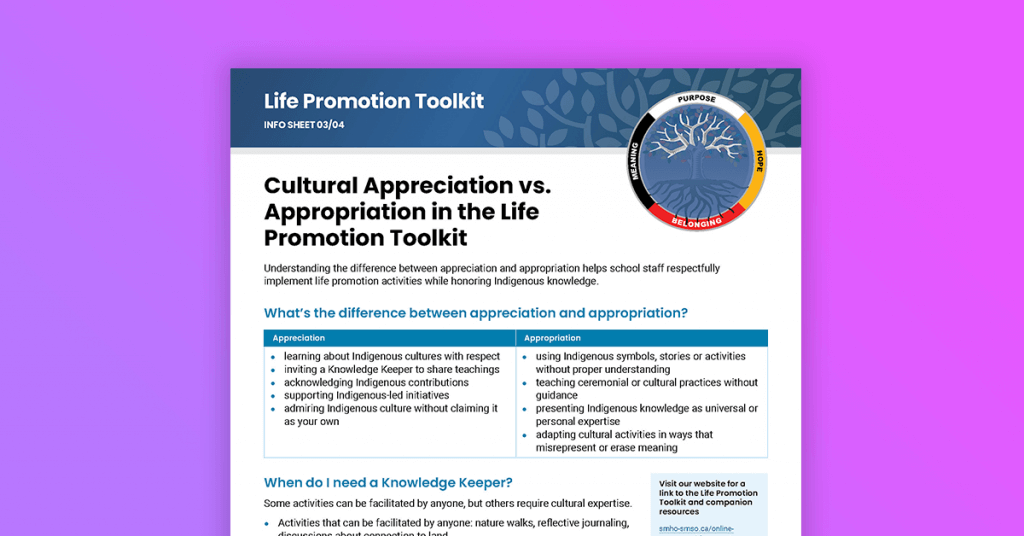 To help school staff implement these activities, School Mental Health Ontario has developed companion resources including videos and info sheets. These materials provide practical strategies to integrate life promotion into classrooms and school communities in a respectful and meaningful way.